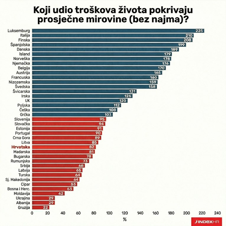 Analiza koja upoređuje penzije sa troškovima života krajem oktobra 2025. godine pokazuje ogromne razlike širom kontinenta. Odnos se kreće od samo 22 procenta u Gruziji do čak 225 procenata u Luksemburgu. Podaci o troškovima života, koje je sastavio Numbeo, predstavljaju nacionalni prosek za samca i ne uključuju kiriju, dok podaci o penzijama potiču iz analize Moorepay-a.