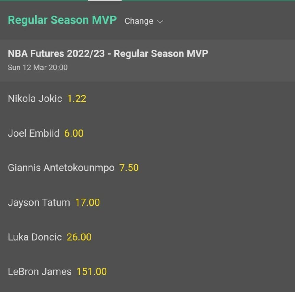 Kvota da će Jokić zavredeti prizananje najboljeg na planeti iznosi mizernih 1,22. Ako želite da to prevedemo u procente Nikoline šanse su 80%, dok su ostali zajedno imaju tek 20% šansi.