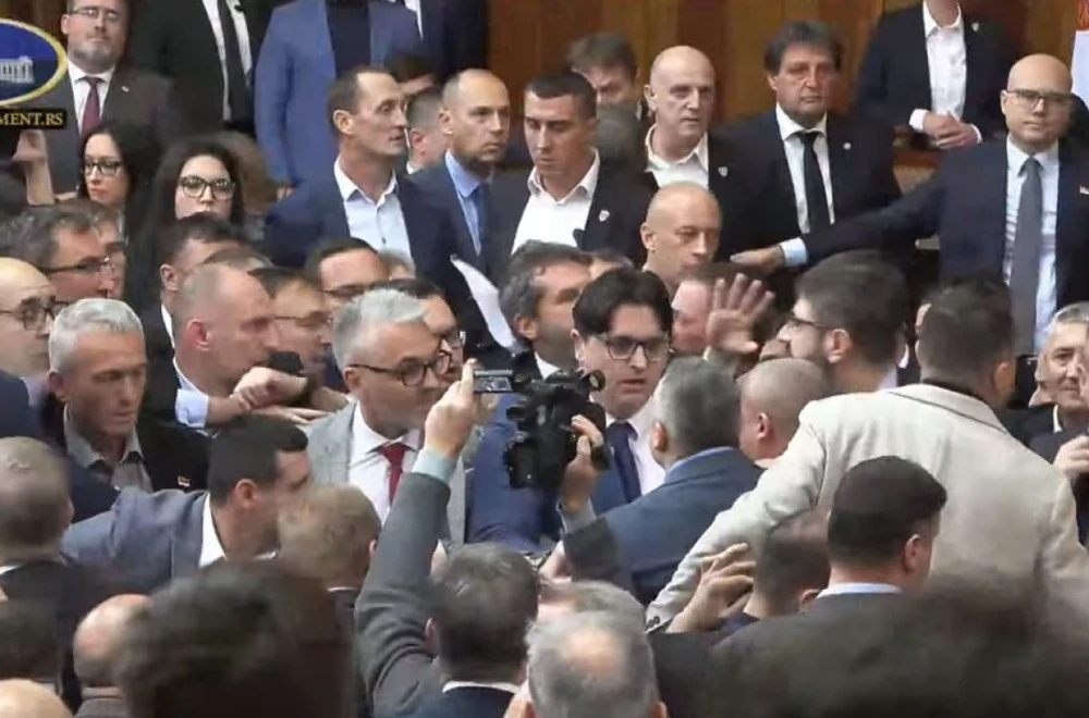 U Skupštini Srbije je došlo do tuče između poslanika vlasti i opozicije, pošto su poslanici opozicije nakon usvajanja dnevnog reda prvo podigli transparente, a potom pokušali fizički da spreče početak rasprave kada su u salu ušli članovi Vlade.
